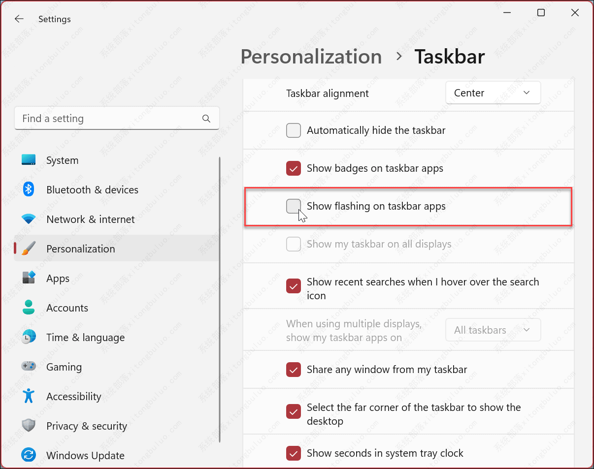 展开任务栏菜单后,向下滚动并取消选中在任务栏应用程序选项上显示闪烁。