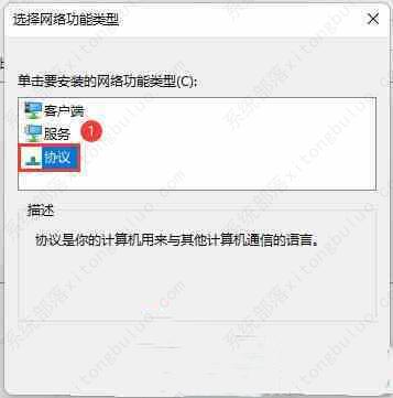 6、选择网络功能类型窗口,选择【协议 】,再点击【添加 】。