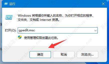 2、输入“gpedit.msc”,点击“确定”打开组策略。
