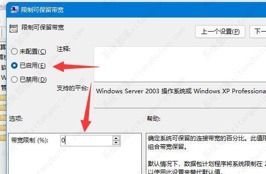 5、勾选“已启用”,并将下方带宽限制改成“0”,最后点击“确定”保存即可。