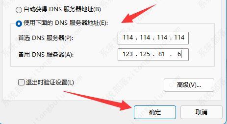 6、勾选“使用下面的DNS服务器地址”并按图示修改,再点击“确定”即可提高下载速度。
