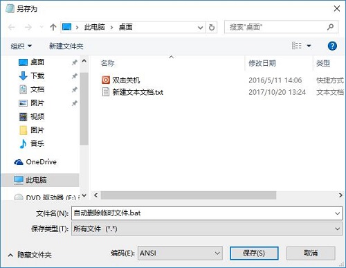 2、点击 文件 -- 另存为,文件名后缀要以.bat后缀结尾,下面的保存类型选择“所有类型”。保存好的文件先放在桌面,如图: