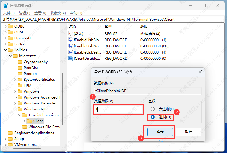 4、双击打开【fClientDisableUDP】,将数值数据设置为【1】,并选择【十进制】,再点击【确定】;