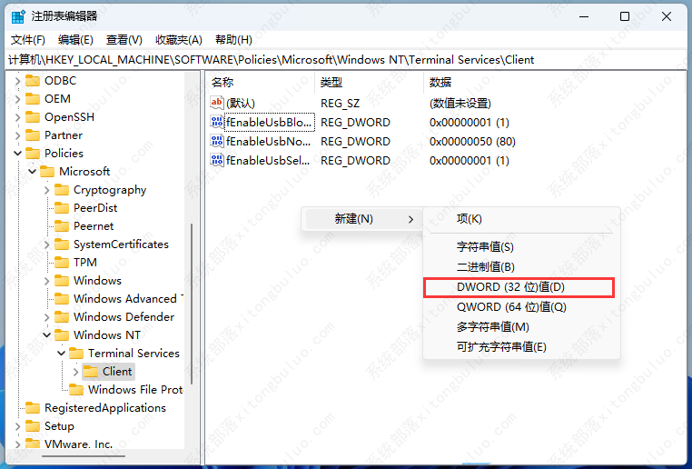 3、接着在右侧空白处,点击右键,打开的菜单项中,选择【新建 - DWORD (32 位)值(D)】,并命名为【fClientDisableUDP】;