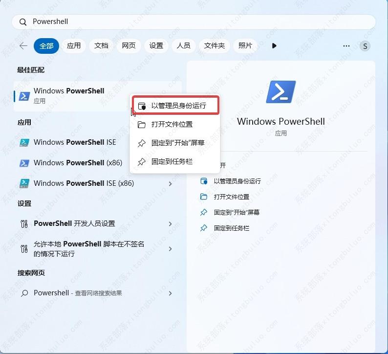 2、在搜索栏重输入 PowerShell,然后选择“以管理员身份运行”。