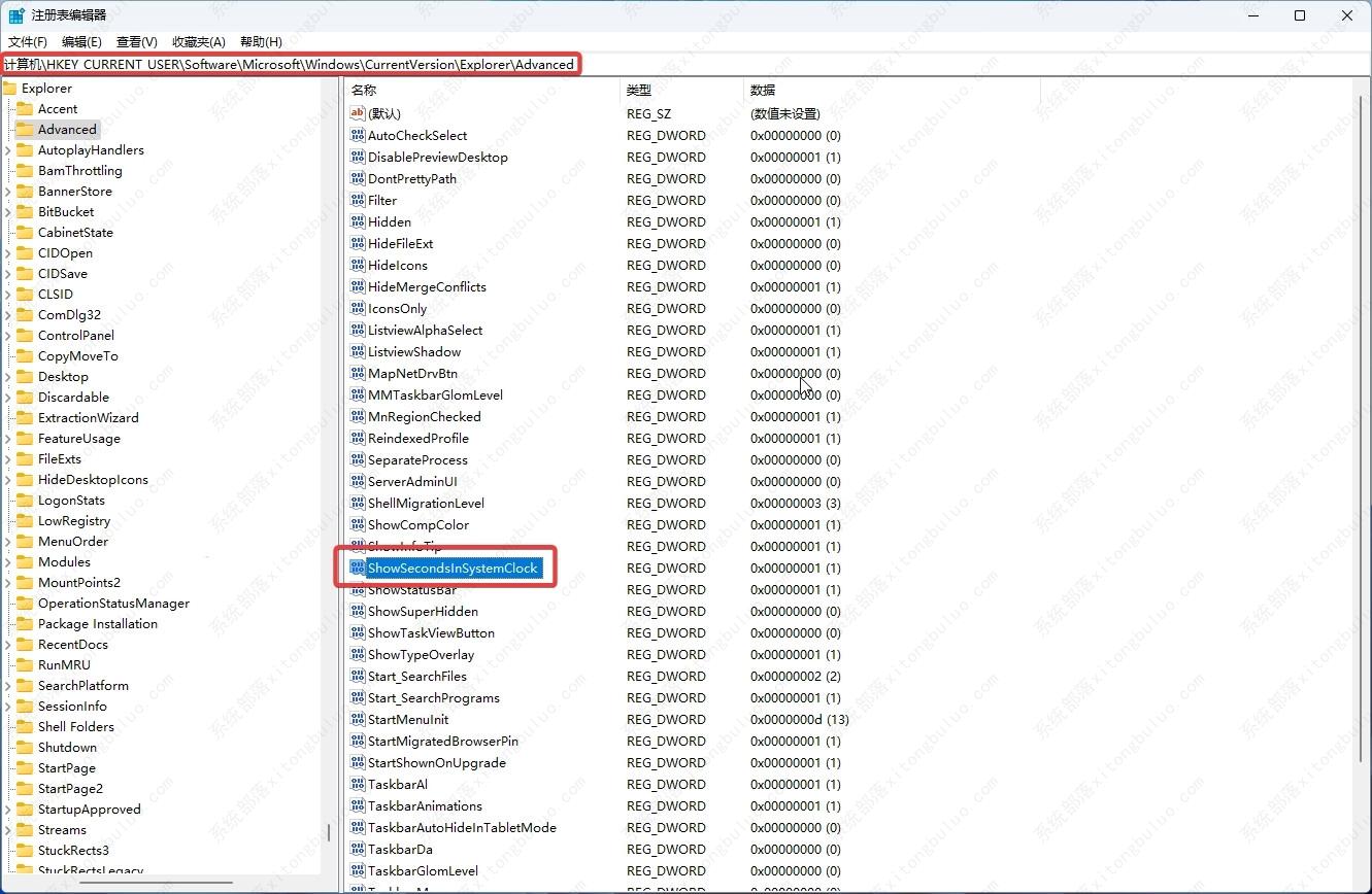 4、找到“ShowSecondsInSystemClock”。如果没有发现,那么可以选择“新建”--》“DWORD (32 位) 值”,将其命名为“ShowSecondsInSystemClock”。