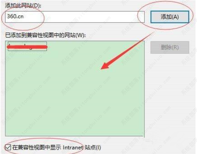 3、在进入设置后添加一个网站并在兼容性视图中查看【显示Internet站点】。