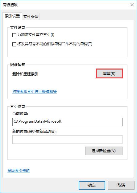 3、在高级选项的默认索引设置界面下点击【重建】按钮,在弹出的框中 点击确定!