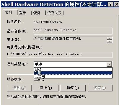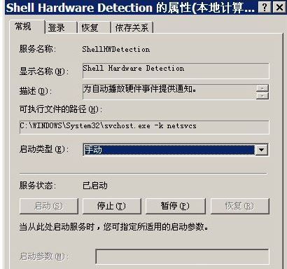 6、在Shell Hardware Detection的属性菜单中,启动类型,如果为手动改为自动,单击确定,重新启动电脑,就会感觉桌面上的图标显现快了很多。如果为自动改为手动,单击确定,重新启动电脑,再将手动改为自动,单击确定,重新启动电脑,就会感觉桌面上的图标显现快了很多。