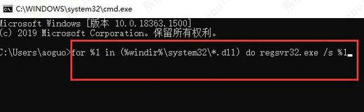 4、在其中输入“for %1 in (%windir%\system32\*.dll) do regsvr32.exe /s %1”回车确定,用来重新注册所有的dll文件。
