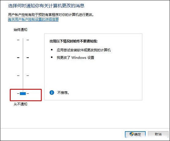 4、在弹出的选择何时通知你有关计算机更改的消息下面滑块移动到最下面,点击【确定】保存设设置即可。