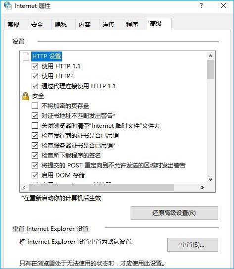 3、在internet 属性界面点击【高级】选卡,在设置框中将“使用SSL 3.0”、“使用SSL 1.0”、“使用SSL 1.1”、“使用SSL 1.2” 5项勾选起来,点击应用并确定。如图: