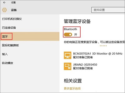 2、在设备窗口的左侧选择“蓝牙”选项,在右侧即可看到【蓝牙】开关,将开关打开即可,如图: