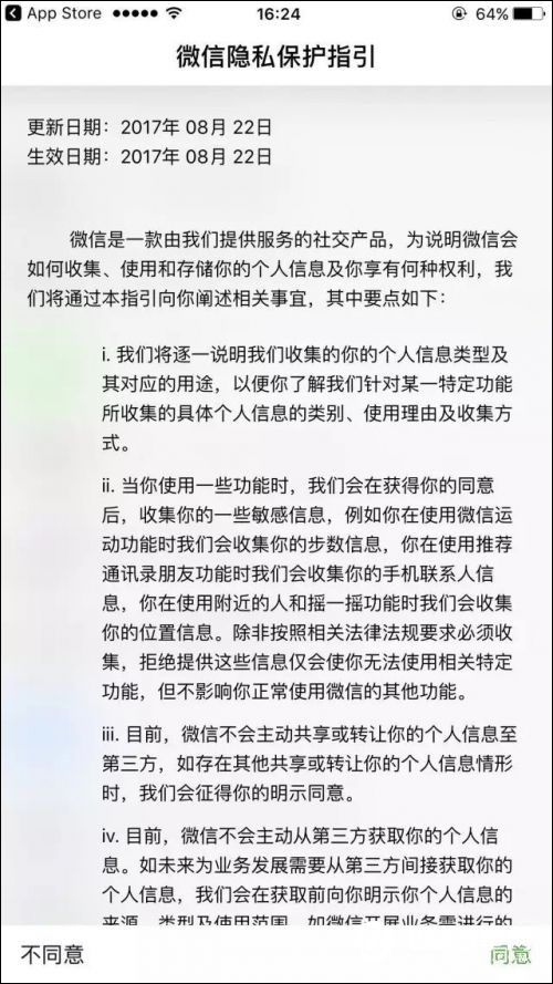 腾讯在9月14日晚间进行了微信版本更新,微信顺带更新了《隐私保护指引》,用户的首次登入微信时就会收到最新的《隐私保护指引》,用户在阅读完毕后需要同意《隐私保护指引》才能正常使用微信,若点击“不同意”可能影响正常登录及使用微信。