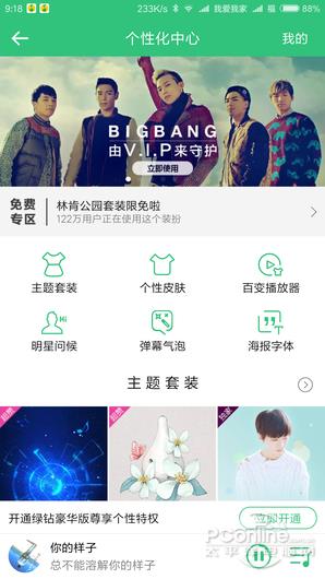 QQ音乐支持换主题,换皮肤,换播放器样式、弹幕气泡样式、海报字体等个性化操作界面,只是多数需要绿钻用户才能使用。