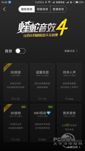 可以看到,参评的5大音乐应用基础功能都比较的完善,特别是听歌识曲这个让用户可以找到街头音乐的功能5大音乐应用都齐备了。音效调节均衡器和内置多种音效5大音乐应用也齐备了,只是虾米及网易云音乐把它隐藏的比较深。