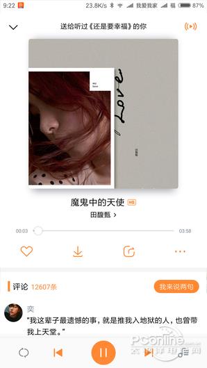 虾米音乐的播放器界面采用了海报模式,大大的唱片海报展示出来。点击海报可切换到歌词显示模式。没有直接的音质切换按钮,需要在菜单寻找。拥有寻找类是歌曲按钮、添加喜欢、下载歌曲、分享歌曲、功能菜单按钮。评论区域直接上滑显示,下方一栏控制按钮有删除、上一首下一首暂停、歌曲目录。