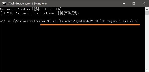 2、在命令提示符中输入:for %1 in (%windir%system32*.dll)do regsvr32.exe /s %1 按下回车键;如图所示: