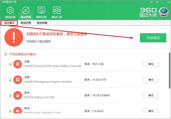 3、在下面点击 驱动备份 ,然后将需要备份的驱动勾选起来,点击【开始备份】即可!
