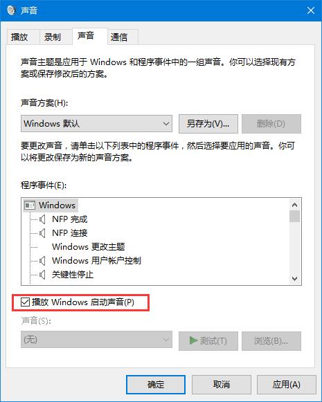 2、在打开的声音界面,切换到【声音】选卡,在下面勾选 播放 Windows 启动声音 ,点击确定即可开启win10系统开机音。