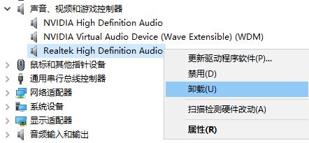 2、在设备管理器中 展开 声音、视频和游戏控制器,在声卡设备上单击右键,选择 卸载 ;