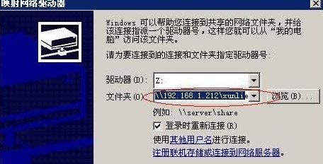 2、在文件夹输入映射路径:192.168.1.212xunleidown映射远端共享文件(xunleidown)到本地驱动器盘符Z;这如同linux下在的挂载命令: