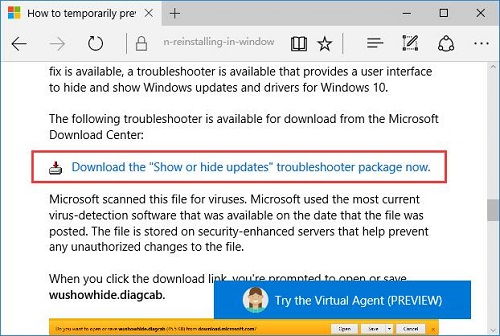 5、在打开的网站中点击Download the "Show or hide updates" troubleshooter package now.,如图: