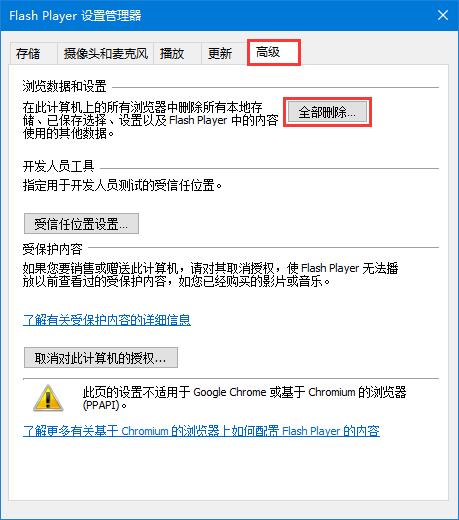 3、在 Flahs Player 设置管理器 框中切换到【高级】选卡,在浏览数据和设置下点击【全部删除】按钮;