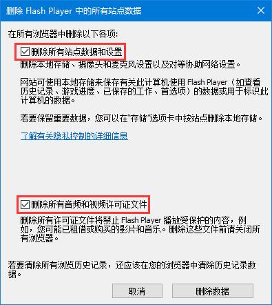 4、在 删除 Flash Player 中的所有站点数据 框中 勾选【删除所有音频和视频许可证文件】以及【删除所有站点数据和设置】(默认已勾选)点击删除数据;