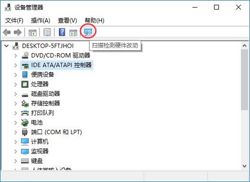 3、在调出“设备管理器”点选其中一项,之后点击菜单栏“操作”-“扫描检测硬件改动”刷新一下当前设备,之后查看是否恢复!