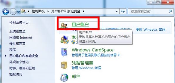 1、打开“控制面板”,点击“用户账户和家庭安全”项进入。