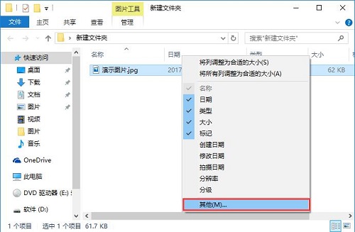 2、在“名称”、“日期”、“类型”、“大小”或“标记”任意一栏上单击鼠标右键,选择“其他”;