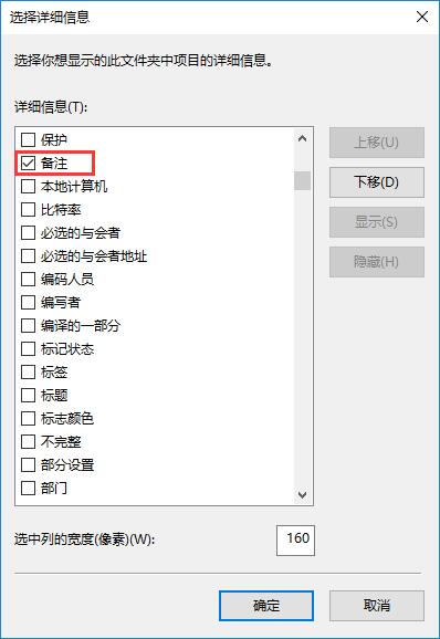 3、在详细信息框中找到“备注”并将其勾选起来,点击“确定”就可以了。