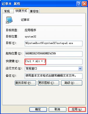 在计算机使用过程中记事本可算是鞠躬尽瘁了,用它的地方老多老多的,可是每次总不能是“开始/程序/附件/记事本”或者“鼠标右键/新建/文本文档”吧,浪费时间不说,还容易误操作!那么我们就让它随叫随到,依次打开:开始菜单--所有程序--附件--记事本,右键属性(不能从%systemroot%system32目录去找notepad.exe的属性,这里没有快捷键的设置选项卡,XP或Win7情况相同),在“快捷键”窗口按下你想使用的快捷键,确定,不过在此处键入的启动或切换到该程序的快捷键自动包括了Ctrl+Alt组合键,请按要添加的该组合键中键,例如,要定义Ctlr+ALT+H组合的快捷键,请按H。不能使用ESC、Enter、TAB,空格键、Print screen、Delete或backspace作为组合键中的按键。其他程序不能使用该组合键,如果该快捷键与基于windows的程序中的访问键冲突,则访问键就不起作用。访问键是某个字母或数字,即当它与ALT键组合使用时,其效果与使用鼠标单击命令的效果相同。