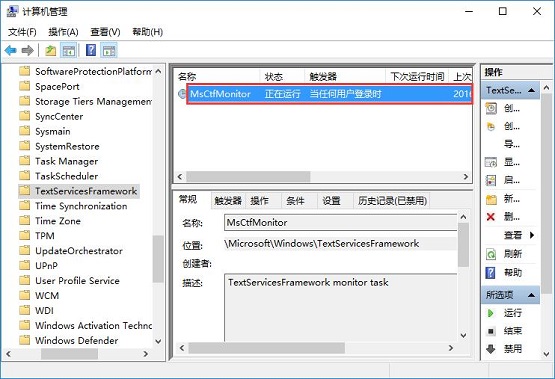 3、点击任务计划程序前面的小三角图标,依次展开“Microsoft/Windows/TextServicesFramework”菜单项。