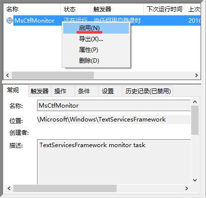 5、右键点击MsCtrMonitor项,然后在弹出窗口中选择“启用”菜单项,这样就可以使用Win10 输入法输入中文了。