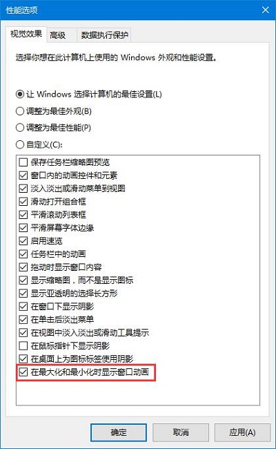 4、在“性能选项”的“视觉效果”选项卡中,查看是否勾选了“在最大化和最小化时显示动画窗口”,勾选的情况下会有“暗屏”效果,不勾选就没有,如下图——