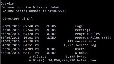 在命令提示符里,跳转到系统所在的盘。注意,在这里系统可能不在C盘。在这个例子里,系统在D盘。所以我们输入“【盘符】:”。输入dir命令确认一下是系统盘。