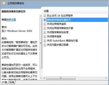 4、在右侧窗口中双击“删除程序兼容性属性页”;