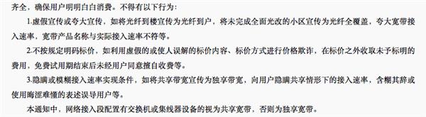 通知内直接要求了在宣传上不许弄虚作假,必须明确告知宽带是“共享”还是“独享”,服务协议上必须以“显著的方式提醒用户”注意“宽带上、下行速率”,“不得隐瞒或淡化限制条款”。