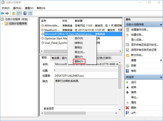 4、在左侧点击【任务计划程序库】,右键点击“MicrosoftOffice 15 Sync Maintenance” ,选择“删除”,在弹出的框中点击【是】即可。