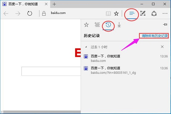 2、接着下来我们就可以看到历史浏览记录了,点击就能打开看过的网而,如果要删除的话,在弹出来的菜单中点击“清除所有历史记录”;