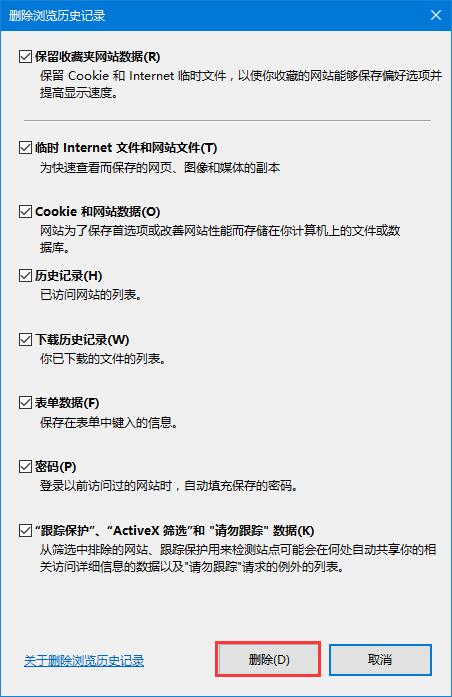 2、勾选所有选项,点击“删除”,删除完成后,在Internet选项框中点击“确定”,等待自动删除缓存文件后即可正常访问路由器设置界面。