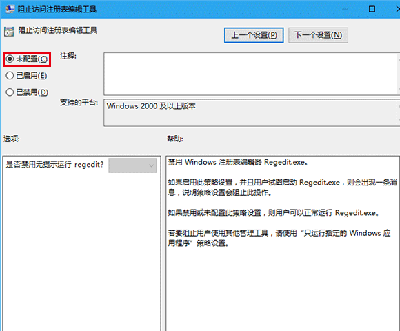 4、把其中的“已启用”改为“未配置”或“已禁用”(如上图)即可解锁注册表编辑器