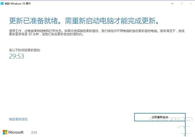 7、完成后,可以选择是否立即重启以进行更新。选择立即重启,便可以正常开启Win10创意者更新正式版的升级。