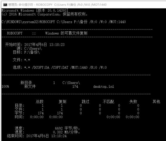 ROBOCOPY C:Users F:备份 /R:0 /W:0 /MOT:1440