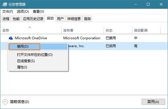 3、在下面将不需要开机启动的程序上单击右键,选择【禁用】即可。