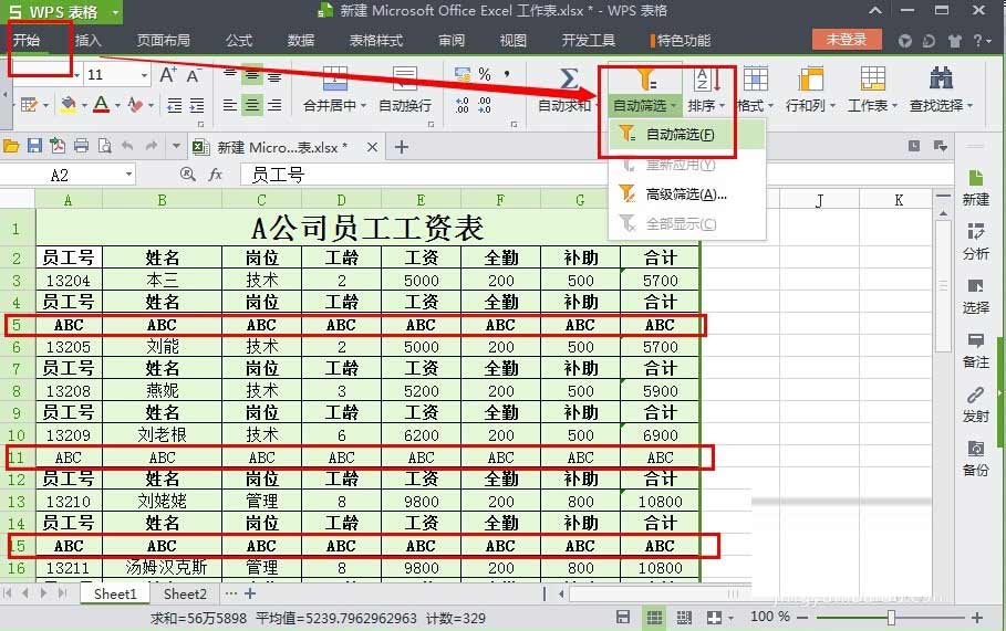 7、这时候我们发现原来表格的空白处单元格都已经被替换为ABC的内容了。我们选择表格A-H列----开始---自动筛选。