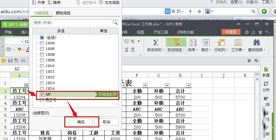 11、这时候含有ABC内容的行就被删除了。继续筛选----全选----确定。
