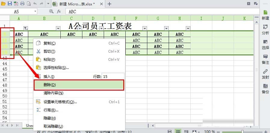 10、我们发现所有含有ABC内容的行都被筛选到一起来了。选择所有ABC行----右击鼠标----删除。
